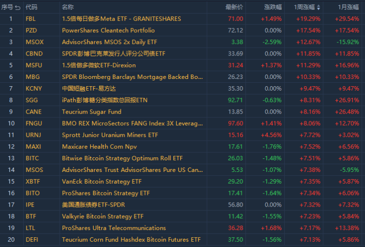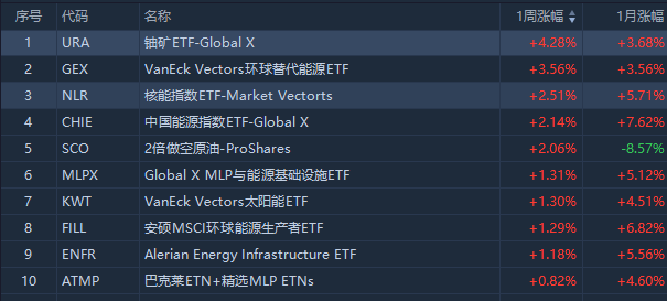 此外,追踪清洁能源的ETF $PZD 和追踪美国大麻产业的ETF $MSOX 周涨分别为17.54%和12.67%。