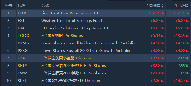 股指ETF方面,本周多做纳指涨幅居前,3倍做多纳指涨超5%。