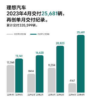 理想汽车公布,2023年4月交付25681辆,理想L7单月交付破万。2023年4月,理想汽车共交付新车25681辆,再次创下理想汽车单月交付的新纪录并连续两个月交付超2万辆,同比增长516.3%。截止到2023年4月30日,理想汽车累计交付量为335599辆。