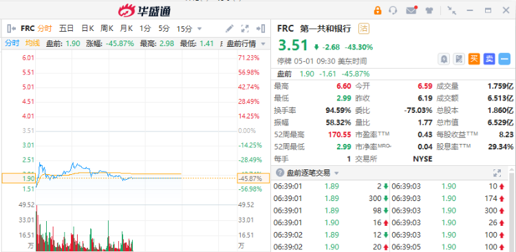 随后,摩根大通表示,收购第一共和银行的交易已经完成。据悉,这是年内第三家被FDIC接管的银行,同时也是美国历史上第二大的破产银行。截至发稿,第一共和银行盘前停牌,跌近46%。