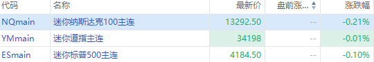 美股盘前,三大期指盘前微跌,截至20:30,纳指期货 $NQmain 跌0.21%,标普500指数期货 $ESmain 跌0.10%,道指期货 $YMmain 跌0.01%。