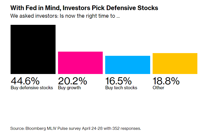 由于美联储将在五月继续加息,企业未来的回报给投资者带来了很大的压力。受访者认为,防御型股在未来几个月的表现将好于科技类股,这对伯克希尔来说是个好兆头,因为鉴于近期估值过高,巴菲特可能会避免投资科技类股。