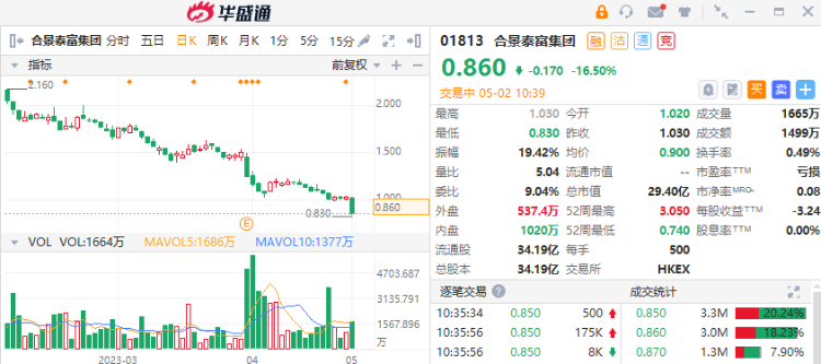 合景泰富集团(01813)早盘一度重挫逾19%,截至发稿,跌16.50%,报0.86港元,成交额1499万港元。