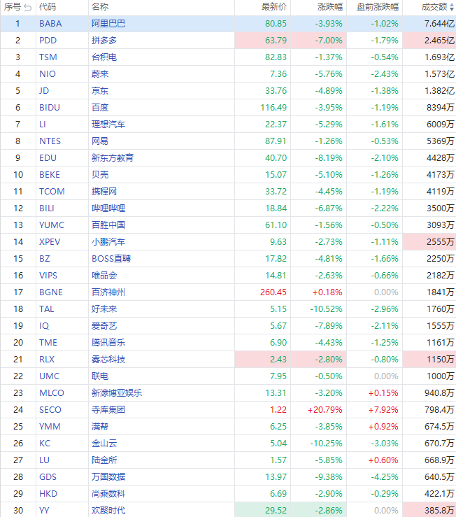华盛资讯5月2日消息,中概股短线下挫,纳斯达克中国金龙指数跌超4%,3倍做空富时中国50指数ETF $YANG 涨超7%。寺库集团 $SECO 涨超25%,金山云 $KC 跌超10%,万国数据 $GDS 跌超9%,爱奇艺 $IQ 跌超7%,拼多多 $PDD 跌超7%,哔哩哔哩 $BILI 跌超6%,阿里巴巴 $BABA 跌超3%;造车新势力普跌,蔚来 $NIO 、理想汽车 $LI 跌超5%,小鹏汽车 $XPEV 跌超2%。中概在线教育股领跌,好未来 $TAL 跌超10%,新东方教育 $EDU 跌超8%,高途 $GOTU 跌超6%,有道 $DAO 跌超4%。