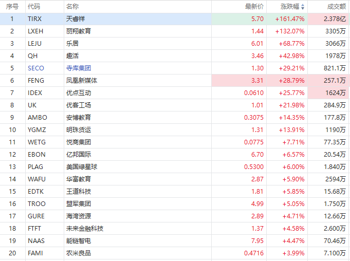 部分小盘中概股盘初暴涨,天睿祥 $TIRX 涨超161%,丽翔教育 $LXEH 涨超132%,乐居 $LC 涨超68%,趣活 $QH 涨超42%,凤凰新媒体 $FENG 涨超28%。