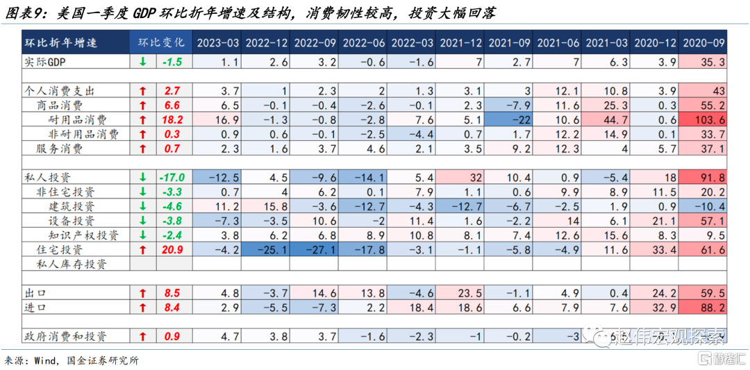 要闻:4月27日,美国公布2023年一季度GDP数据,一季度实际GDP初值年化环比增1.1%,预期增2.0%,前值增2.6%。