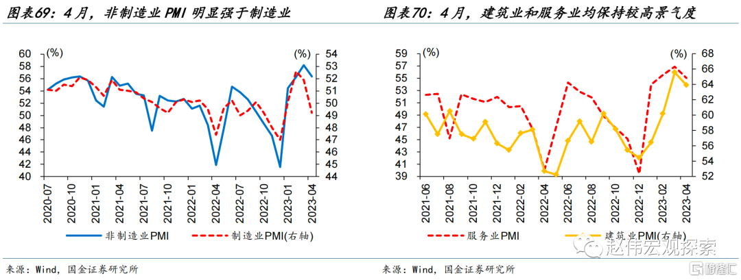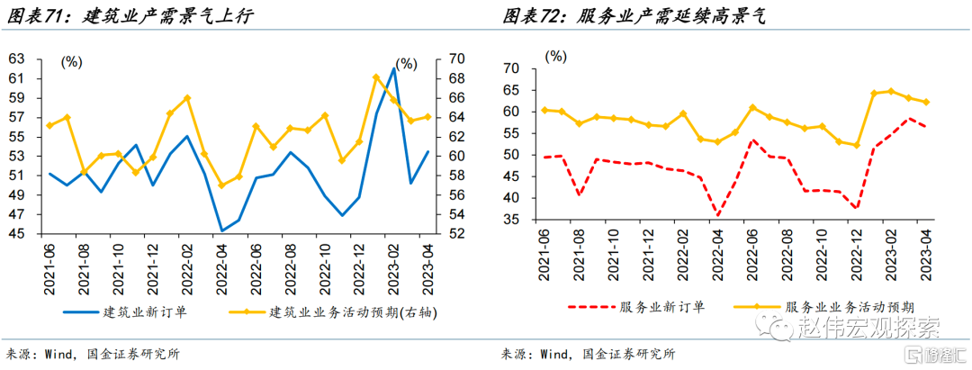 非制造业PMI强于制造业,建筑业和服务业均保持高景气。4月,非制造业PMI录得56.4%、远好于制造业的49.2%。建筑业的贡献仍较大、PMI录得63.9%,服务业PMI回落1.8个百分点至55.1%、仍处于高景气区间,线下活动修复和服务业新经济表现亮眼。与此同时,建筑业新订单指数和业务活动预期指数分别回升3.3、0.4个百分点至53.5%、64.1%,服务业新订单指数和业务活动预期指数继续保持高景气度,分别录得56.4%和62.3%。
