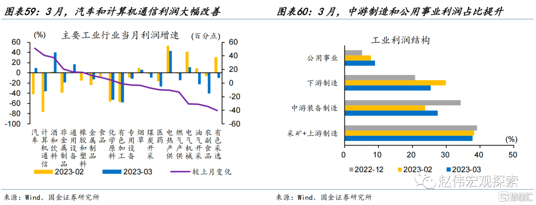 中游装备制等行业利润实现正增长、出行相关边际修复尤为明显,利润分配格局有所改善。 41个工业大类行业中,有15个行业当月利润正增长,电热产供(42.8%)、酒和饮料(40%)、运输设备(25.6%)、电气机械(11%)、汽车(9.4%),等行业利润增长较快; 相较1-2月,汽车、计算机通信、酒和饮料的改善幅度较大,分别回升51、41个和38个百分点。 上述行业带动下,中游装备、公用事业利润占比提升,而采矿和上游行业利润占比持续下降。