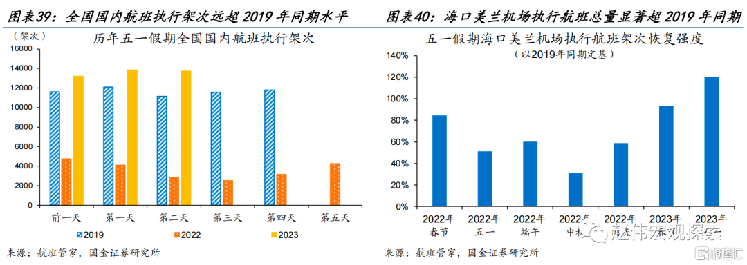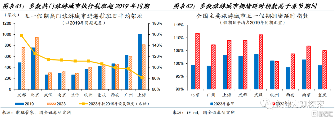 五一期间航班执行情况显著超2019年同期水平,跨区、市内出行均显著改善。五一前三日(4月29日至5月1日),全国国内客运执行航班合计架次较去年同期提升249.8%、增幅显著高于春节期间的91%,较2019年同期提升16.9%;其中海口美兰机场执行航班较2019年同期的恢复强度达120.4%、显著高于春节的93.3%。分城市来看,多数热门旅游城市跨区人口流动显著提升,10大热门旅游城市进港航班架次较2019年同期平均恢复强度达111.7%;市内人流明显好转,热门旅游城市拥堵延时指数平均达2019年同期的107.1%、显著高于春节期间的100.8%。
