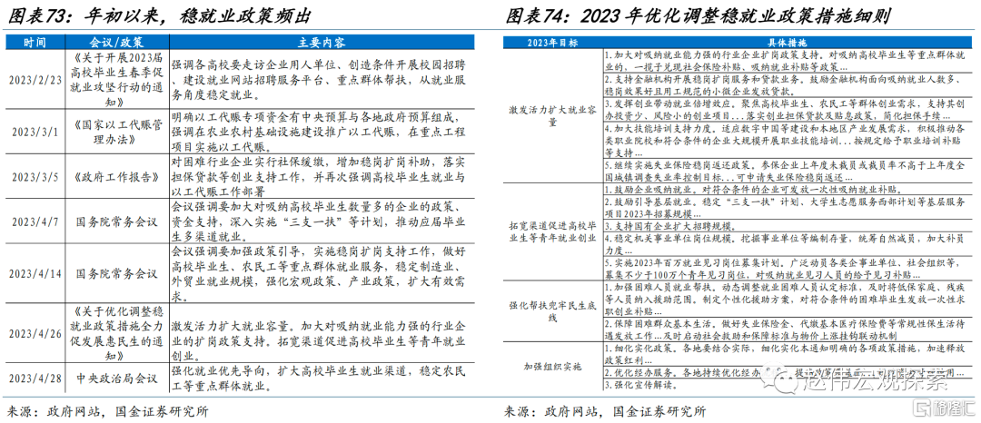 简评:针对中低收入人群收入修复缓慢、青年就业承压等,国务院时隔八年再发文,稳就业政策力度升级。年初以来,国常会多次研讨稳就业事项,国务院继2015年之后再次出台促进就业文件;《通知》从激发活力扩大就业容量、拓宽渠道促进高校毕业生等青年就业创业、强化帮扶兜牢民生底线等四方面提出15条具体的稳就业措施,与2015年出台的稳就业政策相比,更强调加大金融机构贷款业务、支持国有企业、事业单位扩大招聘规模等举措,后续相关稳就业政策细则或加速落地。