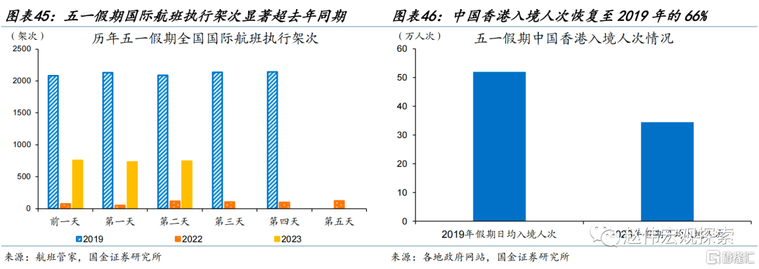 五一假期出境旅游加快修复,但较疫情前水平仍有一定差距。去哪儿网数据显示,五一期间,出境游机票预订量已恢复至2019年同期的45%;从实际出境情况来看,五一假期前三日(4月29日至5月1日),全国国际客运执行航班合计架次较去年同期提升813.9%、占2019年同期的比重由春节的7.9%提升至35%,但较疫前水平仍有较大差距、恢复至2019年同期水平的35.4%。五一假期出境热门目的地以短线的中国港澳、东南亚地区为主,其中今年五一假期中国香港日均入境人次达34.5万人次、恢复至2019年同期水平的66.3%。