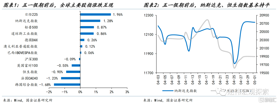 全球股市:主要股指走势分化。假期前后(4月24日-5月2日),纳指、标普500、道指分别上涨1.28%、0.87%和0.86%。亚欧股指方面,日经225大涨1.96%,恒生指数、法国CAC40和英国富时100分别下跌0.90%、1.23%、0.55%。