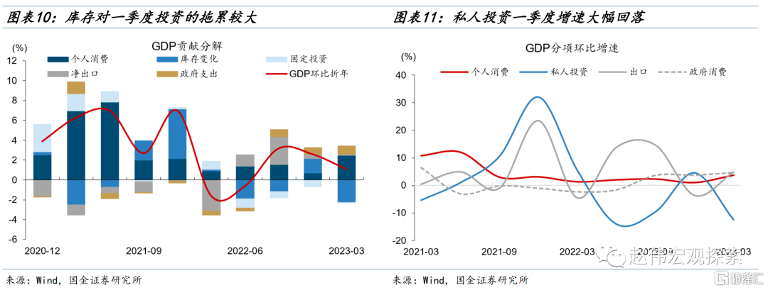 美国GDP增速放缓,表现不及预期。美国一季度实际GDP环比折年增1.1%,预期2%,前值2.6%,连续两个季度增速放缓。私人库存回落是拖累美国经济增长的主因,对GDP贡献率-2.3%,前值1.5%,回落幅度达疫情以来最大。