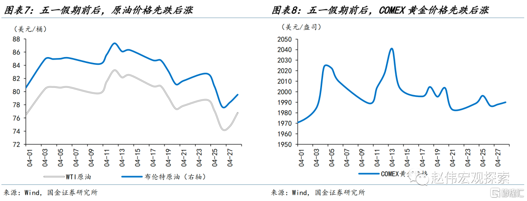五一假期前后(4月24日-5月2日),油价、金价均先跌后涨。原油方面,受美国经济衰退担忧的影响,WTI、Brent原油在前三个交易日分别下跌4.59%和4.86%,随后小幅反弹,全周分别下跌1.40%、2.60%至74.76和78.37美元/桶。黄金方面,COMEX黄金一度在4月25日跌至1986.6美元/盎司,随后微涨,全周上涨0.36%至1990美元/盎司。