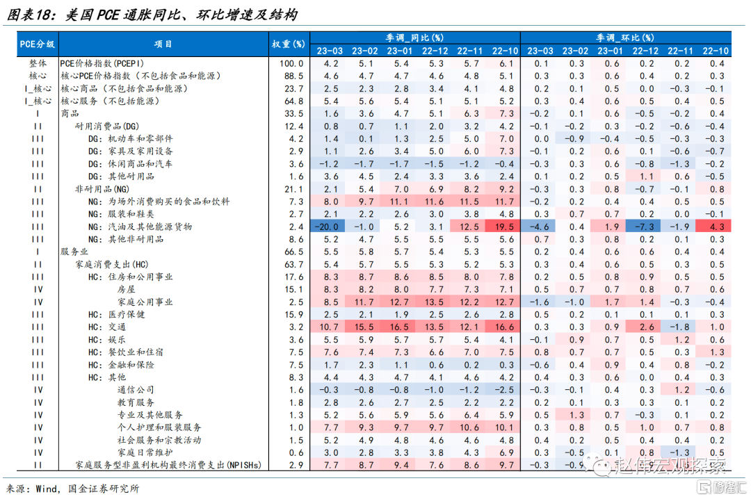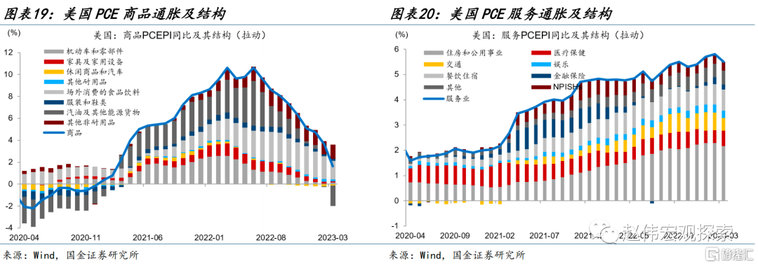 3月商品分项PCE物价指数同比上涨1.6%,前值3.6%,连续9个月下行。各分项中,汽油及其他能源货物大幅下降(3月同比-20.0%,前值-1.0%),拉动商品PCE下降1.9个点。3月服务业分项PCE物价指数同比上涨5.5%,前值5.8%,通胀放缓回落。医疗保健、餐饮住宿、其他三个分项的同比涨幅均有所回升。住房和公用事业同比涨幅有所回落(2月同比8.3%,前值8.7%),但仍是主要拉动项,拉动服务业PCE物价指数2.2个点。