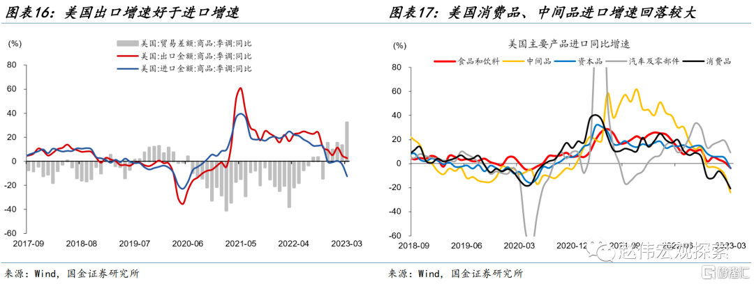 美国进出口增速均改善,出口增速高于进口增速。出口一季度环比增4.8%,前值-3.7%,进口环比增2.9%,前值-5.5%,单季度读数均改善,但仍大幅弱于去年上半年。净出口对GDP贡献率降至0.1%,前值0.4%,连续两个季度回落。一季度主要进口产品增速均明显下滑,消费品、中间品降幅更大,分别回落至-20.6%和-24%。汽车进口情况略好,3月进口增速为9%,食品饮料进口增速降至0以下。