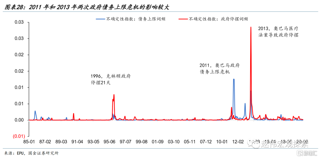 今年的风险点在于参众两院分属两党,两党分歧较大,国会的人员架构等因素与2011及2013年的情形类似,谈判很可能会被拖延到“最后一刻”。干预债务上限需要国会通过立法,此前的2021年,由于民主党同时控制白宫和美国国会两院,在2021年12月相对顺利地将债务上限提高2.5万亿美元至31.4万亿美元。目前,共和党入主众议院,若继续提高债务上限,必须争取共和党的配合,而共和党则将债务上限作为推动削减政府开支的工具,民主党希望在不附加任何条件的情况下提高债务上限,使得谈判难度提高。