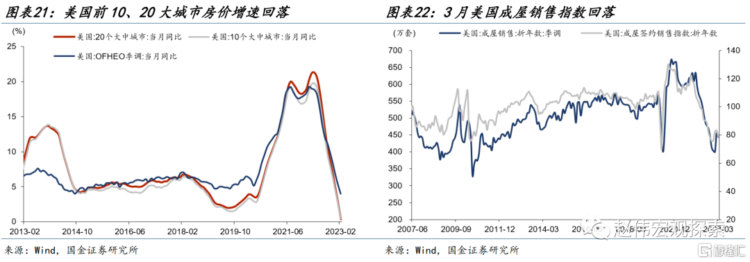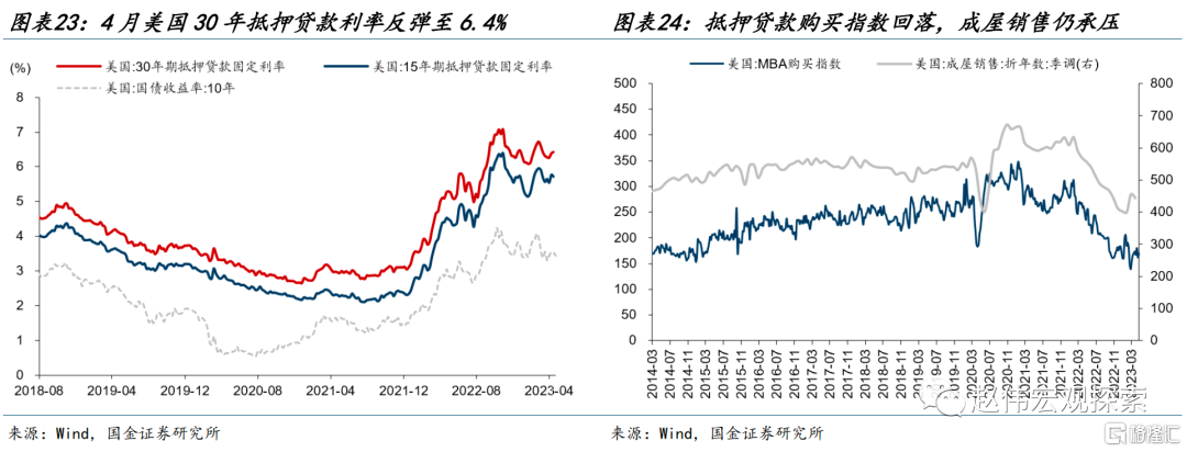 简评:美国房价回落,楼市降温。年初美国房地产市场短暂回暖,但3月份楼市量价齐跌。2月美国前20城房价指数同比降至0.4%,前值2.6%;前10城房价指数同比0.5%,前值2.5%,房价增速明显回落,降至近十年最低值,前20城房价濒临负增长。成屋销售大幅回落,3月成屋销售签约指数降至79,前值83;同比-23%,前值-21%;环比-5%,前值1%。成屋销售量环比下降2.4%,录得444万套。随着30年抵押贷款利率重新反弹至6.4%的高位,MBA购买指数延续回落,美国成屋及新房市场销售将可能持续受抑制。