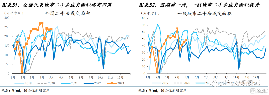简评:五一假期全国商品房季节性回落,但新房、二手房销售表现均好于去年同期。五一假期当周(4月24日至4月30日),30大中城市商品房成交季节性回落、较假期前一周减少18.4%,但总体表现好于去年同期、同比提升28.2%;其中一线城市商品房成交表现较好,五一假期当周,一线城市商品房成交同比提升136.3%、二线城市同比提升11.2%、三线城市同比提升3.3%。五一假期前1周,全国代表性城市二手房成交恢复有所放缓、同比提升17.5%、增幅较前周回落35.8个百分点,其中一线城市二手房成交同比提升7.5%,相较之下,二线城市同比回落1%。