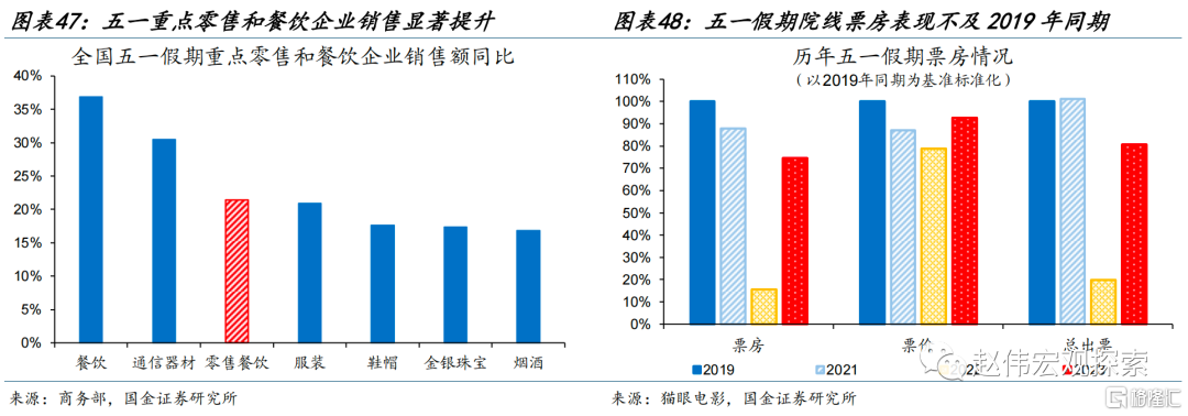 假期线下消费显著改善,但恢复力度不及客流。假期前三日,全国重点零售和餐饮企业销售额同比增长21%、其中餐饮企业增长37%;相较之下,线下消费修复力度略弱于客流,比如:四川省A级景区日均门票收入恢复至2019年同期水平的99%、好于春节的74%,但低于接待旅客的106%;电影票房恢复至2019年同期的75%、不及出票人次的81%。