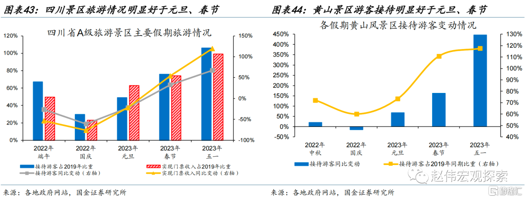 代表地区、热门景点旅客接待已超2019年同期水平。主要景点旅行情况明显改善,五一假期前三日(4月29日至5月1日),四川省A级景区日均接待旅客较去年同期提升67.6%、同比增幅明显超过春节的33%,为2019年同期水平的106.1%,日均实现门票收入较去年同期提升119.3%、同比增幅明显超过春节的54%,为2019年同期水平的99.2%;热门景点黄山风景区假期日均接待游客较去年同期提升446.5%、为2019年同期的117.6%。