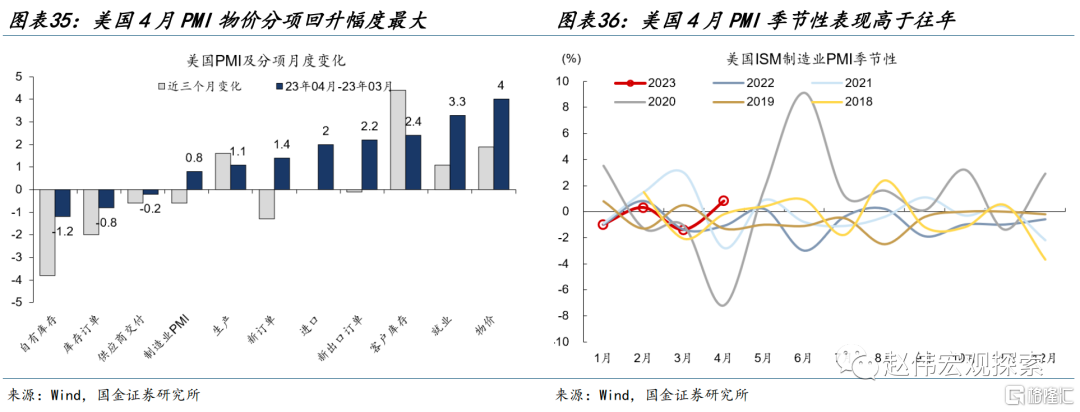 简评:美国制造业PMI环比上升但仍低于荣枯线,多数分项指标不同程度的回升。4月美国制造业PMI录得47.1%,预期46.8%,前值46.3%,连续六个月低于荣枯线。新订单、出口订单、就业、物价、进口分项回升,其中物价分项大幅回升4个点。库存、供应商交付回落。从季节性来看,3月PMI回升0.8个点,处于近五年同期较高水平。