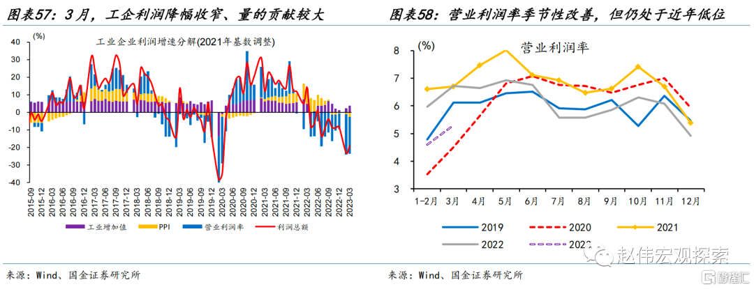 简评:工业企业利润筑底修复,产需边际贡献较大。3月,工业企业利润当月同比下降19.2%、降幅较1-2月收窄3.7个百分点,尽管仍在下降、但在去年高基数下实现降幅收窄,或指向利润筑底。利润边际修复主要缘于产需修复,工业增加值较1-2月回升1.5个百分点,带动营业收入同比转正;价格延续下降、经营成本仍在高位拖累利润率,营业利润降幅仅较1-2月收窄1.8个百分点至-21.2%。