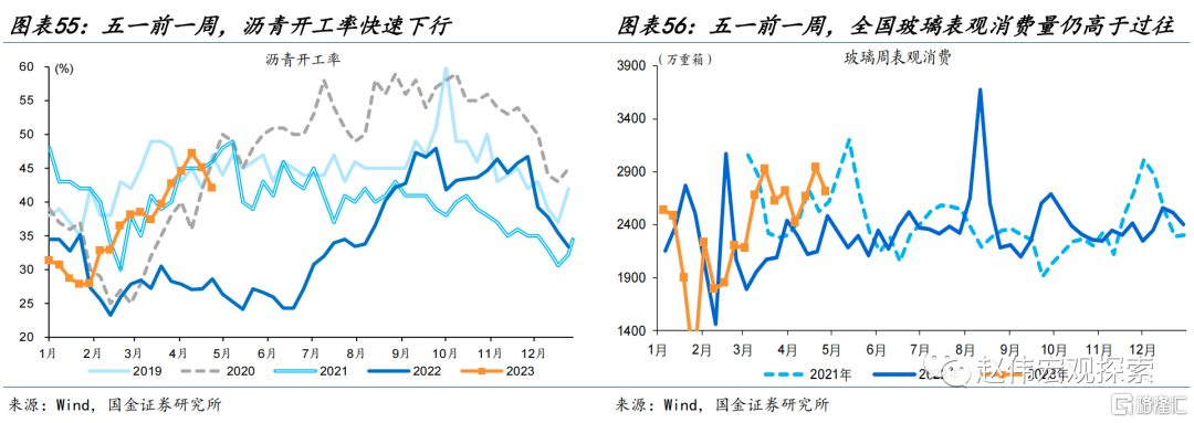 简评:五一假期前多数工业生产、投资活动回落,建筑相关生产活动普遍弱于过往同期。五一假期前1周(4月23日至4月29日),钢材生产开始回落,高炉开工率较前周回落2个百分点至82.6%,其中与建筑相关的螺纹钢开工率表现较弱、较2019、2022年同期分别回落6.6、26.9个百分点;全国水泥粉磨开工率有所回落、较去年同期提升1.3个百分点、较2019年同期回落12.6个百分点;沥青开工率结束上行态势开始回落、较2019年同期回落4.9个百分点,映射地产竣工的玻璃产需表现较好,其中玻璃表观消费量高于2021年同期水平。