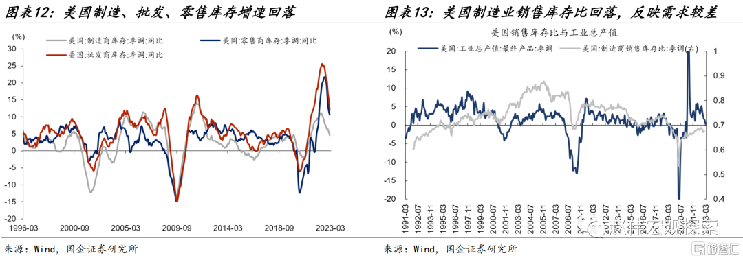 一季度,私人库存回落是拖累美国经济增长的主因,对GDP贡献率-2.3%,前值1.5%,回落幅度达疫情以来最大。库存结构上,今年前三个月美国制造、零售、批发商库存增速均大幅下降,但零售和批发商库存分位仍处于80%以上,终端环节的去库存压力尚未明显缓解。销售库存比继续回落,显示供需两端均较差,需求端回落速度更快。