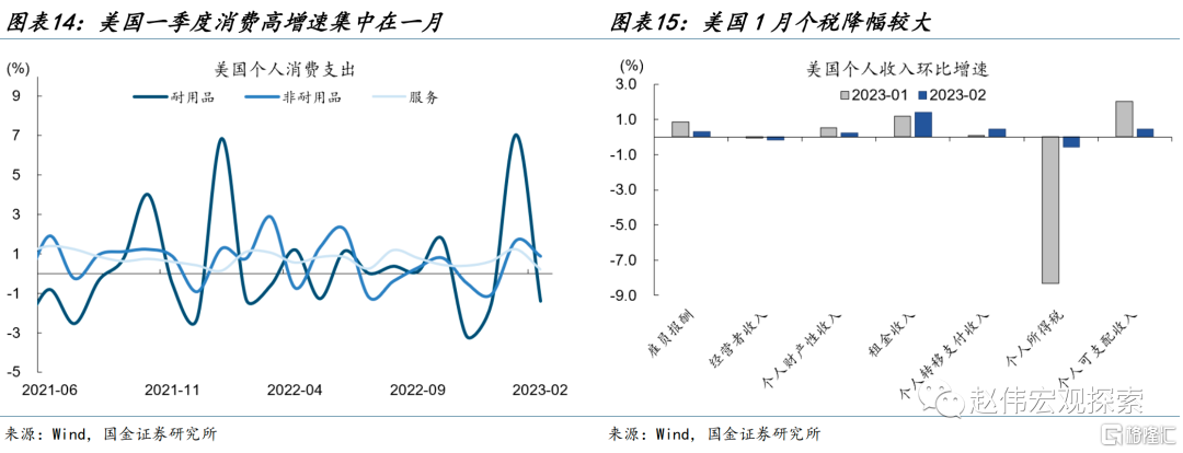 消费增速韧性较高,但高增速主要源自1月个人所得税一次性抵扣减免。一季度个人消费拉动GDP增长2.5个点,是贡献最高的分项。但消费高增长仅集中于1月份,税收抵扣使1月个税下滑8%,个人可支配收入环比增2%,带动耐用品消费支出上涨达7%。至季度末,耐用品、非耐用品、服务消费增速均已明显回落,2月收入增速同样明显回落至0.5%。