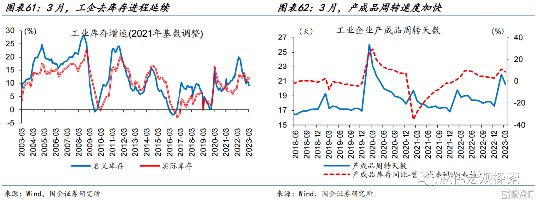 工业企业库存去化延续,周转速度加快或指向去库有望加快。3月,工业企业名义和实际库存同比分别较1-2月下降1.6个和0.5个百分点,分别处于历史分位数51%和60%;剔除基数效应后,两年复合同比分别为13.5%和10.7%,也较本轮库存高点下降超25%和35%。经济活动修复下,产成品周转天数较1-2月下降1.3天;同时,PMI数据显示产成品和原材料库存双双下降,指向企业经营周转有所加快。