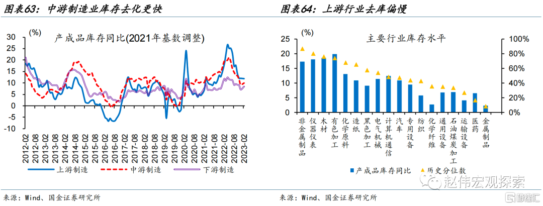 与利润表现类似,中游装备制造去库更快,而偏上游行业去库相对偏慢。1-2月分行业数据显示,中游装备制造的电气机械、计算机通信、通用设备、汽车、运输设备等行业的库存同比处于历史中低分位数水平,而属于上游行业的非金属制品、有色加工、化学原料、黑色金属等行业库存同比的历史分位数水仍高于50%。
