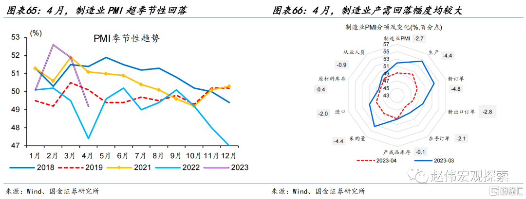 制造业产需双双回落,或与地产链低迷、外需拖累等有关。4月,生产指数和新订单指数分别较3月回落4.4、4.8个百分点至50.2%和48.8%、生产仍处于扩张区间。内需走弱或主要缘于地产施工活动低迷,4月以来螺纹钢产量和价格趋于下行、以黑色系为代表的高耗能行业PMI较3月大幅回落3.2个百分点至47.9%。与此同时,积压出口释放后、外需明显承压,新出口订单回落2.8个百分点至47.6%,带动装备制造业PMI回落。