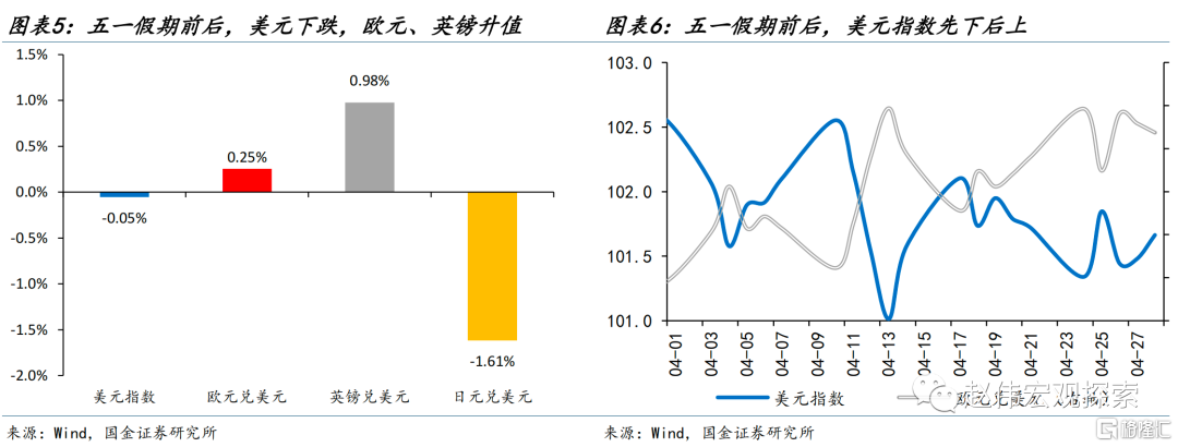 五一假期前后(4月24日-5月2日),美元先下后上,欧元、英镑兑美元小幅升值,日元大幅贬值。美元指数一度在4月26日下行至101.02,随后重新上行,全周累计下跌0.05%至101.48;欧元、英镑兑美元分别上涨0.25%、0.98%至 1.10和1.25;YCC调整落空后,日央行紧缩预期的再修正下,日元兑美元大幅贬值1.61%,日元汇率收至134.02。