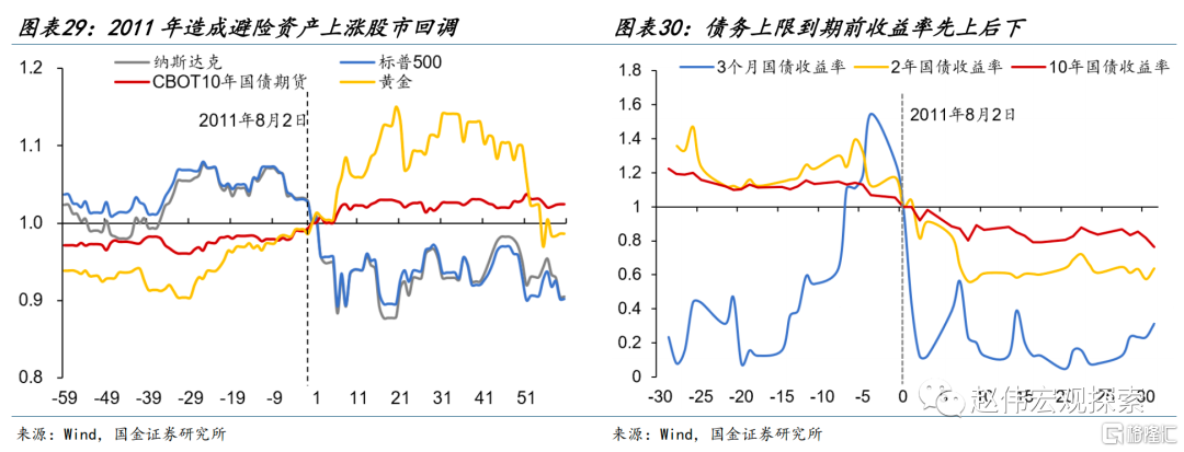尽管未曾出现过实质性违约,但仍有可能造成市场动荡。 在债务上限调整到期前的僵持阶段,避险资产的需求有所上升,股市等风险资产的抛售压力加大。例如2011年8月2日,债务上限到期前引发了市场避险情绪显著上升,股市、债市激烈动荡,黄金飙升近13%,标普500在一个月内暴跌17%,道指下跌15%,10年期美债收益率下行82bps。这一事件导致标普有史以来第一次下调了美国主权信用评级,从AAA降至AA+。