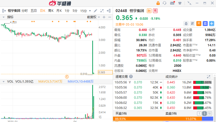 恒宇集团(02448)高开逾15%,随后短线跳水,最新报0.365港元,跌5.19%,振幅达38.96%,成交额5592万港元。