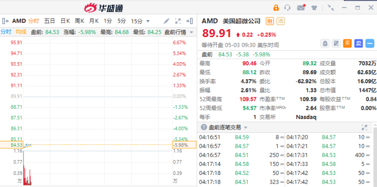 AMD $AMD 盘前跌超6%,Q1营收同比下滑9%至54亿美元,净亏损1.39亿美元同比由盈转亏,Q2营收指引中值53亿美元低于分析师预期的55亿美元。