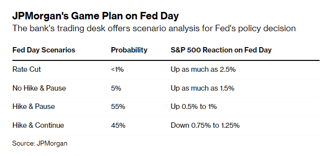 德意志银行研究美国问题的首席经济学家Matthew Luzzetti指出,如果美联储暂停紧缩,那将是一个“出乎意料的巨大事件”。摩根大通团队推演美联储周三决策日的股市表现,认为“加息然后暂停”是最可能出现的情形,这可能推动标普500指数上涨0.5%-1%。