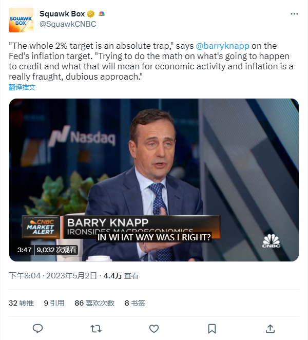 纳普表示,美联储的长期通胀目标是不切实际的,最近的一系列银行倒闭事件最终可能会帮助美联储完成收紧金融环境的工作。他周二在接受CNBC采访时表示: