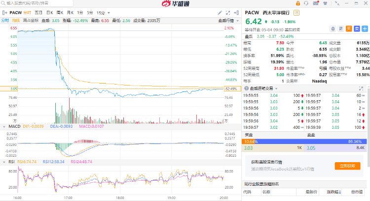 西太平洋合众银行目前市值约为7.5亿美元,今年以来已累计下跌了72%。周三(5月3日),该股在常规交易时段下跌近2%,连续第五个交易日下跌。在上述消息发出后,该公司股票在盘后交易中意外暴跌逾50%。