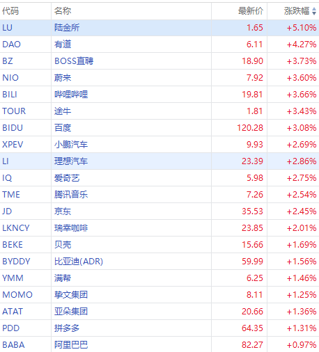 华盛资讯5月4日消息,热门中概股走高,3倍做多富时中国50指数ETF $YINN 涨超6%,陆金所涨超5%,有道涨超4%,BOSS直聘、蔚来、哔哩哔哩、百度涨超3%,小鹏汽车、理想汽车、爱奇艺、京东等涨超2%。