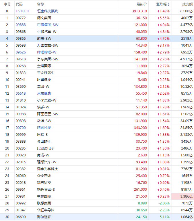 科网股多数反弹,阅文集团涨超5%,百度集团-SW涨超4%;万国数据-SW涨超3%,京东集团-SW、阿里健康、哔哩哔哩-W、京东健康涨超2%、美团-W、小米集团-W、腾讯控股、快手-W、阿里巴巴-SW涨超1%。