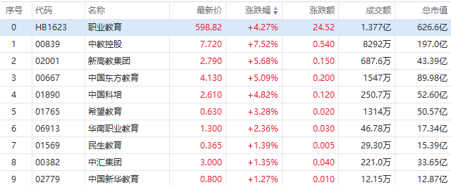 5月5日消息,港股职教股持续走强。截至发稿,中教控股涨7.52%报7.72港元每股,成交额0.83亿港元,新高教集团、中国东方教育涨超5%,中国科培涨4.82%,希望教育涨超3%,民生教育、中国新华教育跟涨。