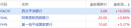 美股地区性银行板块盘前反弹,西太平洋合众银行 $PACW 涨超16%,阿莱恩斯西部银行 $WAL 涨近10%,第一地平线国家银行 $FHN 涨超5%。