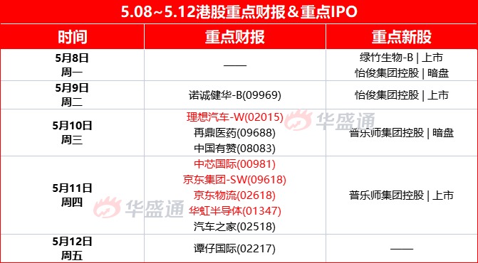 财报方面,港股方面,理想汽车将在周三公布财报;中芯国际、京东集团、华虹半导体将在周四放榜。新股方面,下周将有三家公司上市分别是绿竹生物、怡俊集团控股、普乐师集团控股。