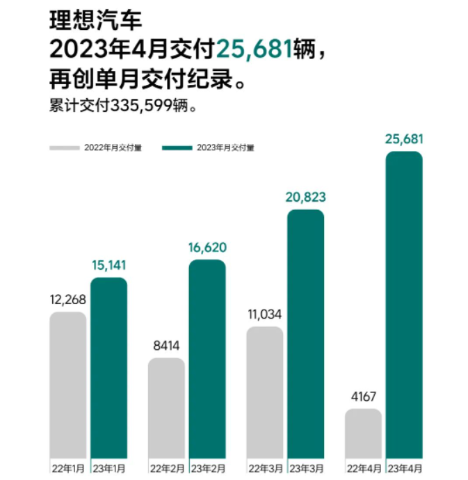 理想汽车:4月交付量为25681辆,同比增长516.3%,再次创下理想汽车单月交付的新纪录并连续两个月交付超2万辆。
