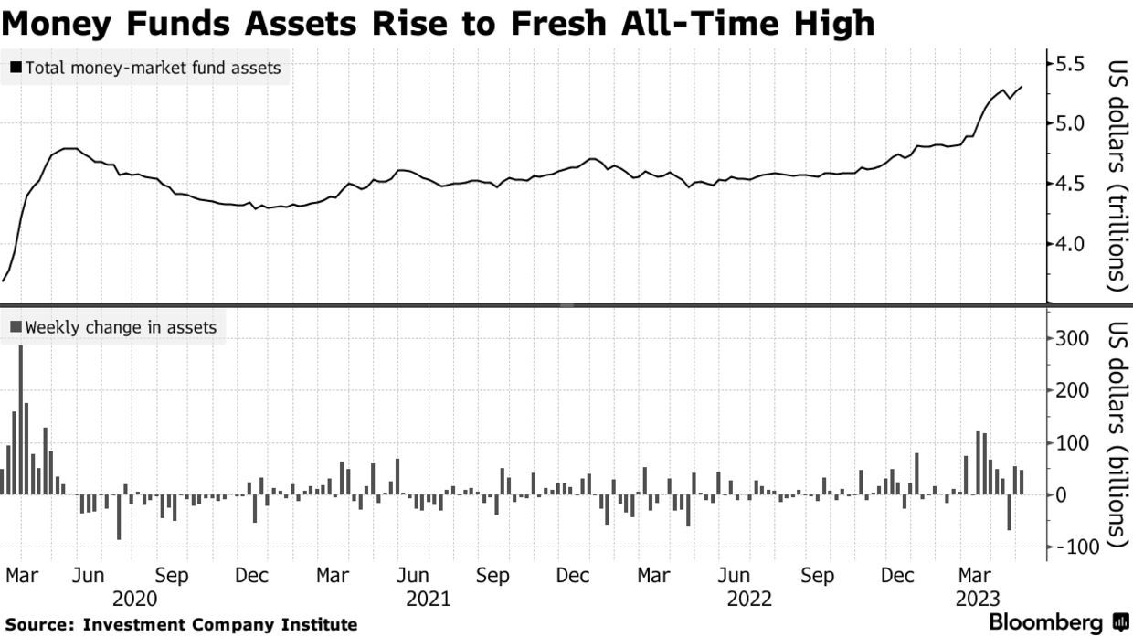 由于银行业危机“死灰复燃”加剧市场担忧、以及美联储加息之下利率提高,货币市场基金资金规模攀升至创纪录高位。美国投资公司协会的数据显示,在截至5月3日的一周内,约有472亿美元流入美国货币市场基金,总资产规模达到创纪录的5.31万亿美元。
