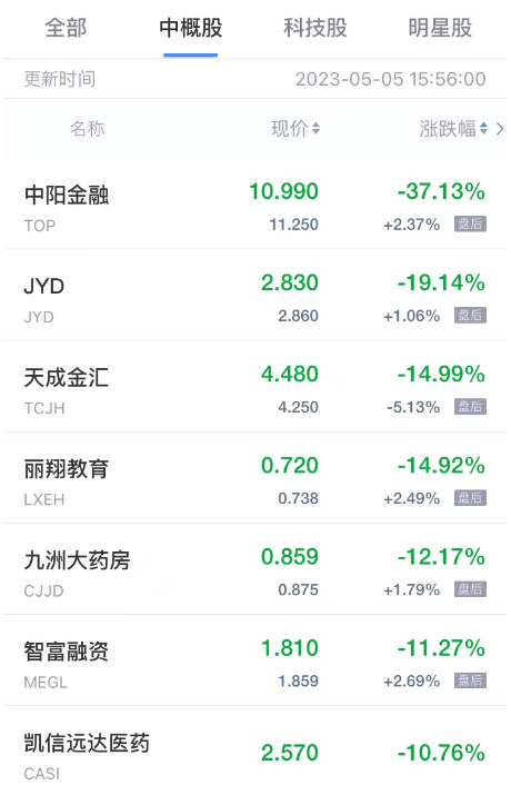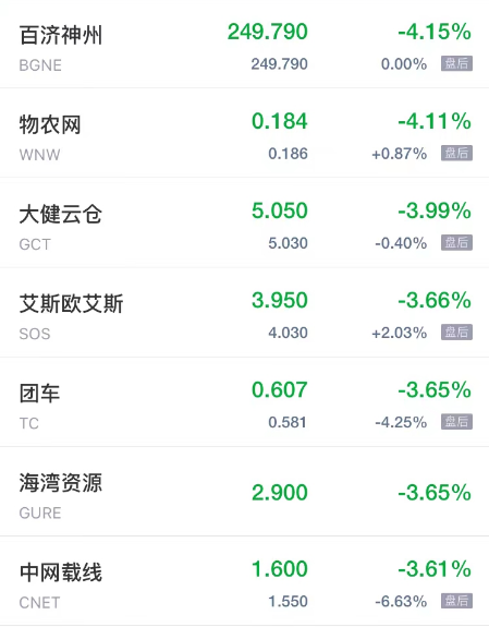 中阳金融跌超37%,百济神州跌超4%,金生游乐跌超3%,万物新生、嘉楠科技、复朗集团、亚朵集团、BOSS直聘跌超2%,拼多多、雾芯科技、禾赛科技、格林酒店、优品车、满帮跌超1%,怪兽充电跌近1%。