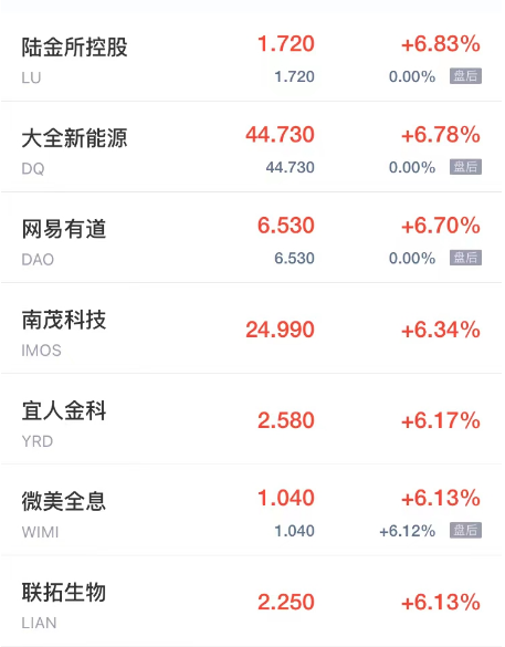 能链智电涨超9%,陆金所控股、大全新能源、网易有道、南茂科技、宜人金科、联拓生物涨超6%,雅乐科技涨超5%,比特数字、达达集团、亘喜生物、涂鸦智能、万国数据、洪恩、信也科技、逸仙电商、诺亚财富涨超4%,阿特斯、乐信、昱辉阳光、兰亭集势、奇景光电涨超3%,亿咖通科技、联电、金山云、搜狐、小i机器人、小鹏汽车、普益财富、高途、360数科、盛丰物流、中通涨超2%,哔哩哔哩、晶科能源、台积电、百度、日月光半导体、WSP控股、金融壹账通、和利时自动化、老虎证券、贝壳、尚乘数科、蔚来、挚文集团、新东方、世纪互联涨超1%,知乎、猎豹移动涨近1%。