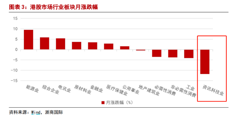 港股板块方面表现互有涨跌,其中以互联网科技成长股为主的资讯科技业走势最为弱势,能源业位居涨幅榜第一,中国能源建设单月飙涨20%。港股通方面,南向资金月度净流入313亿港元,较上月671亿港元的高位有所回落。